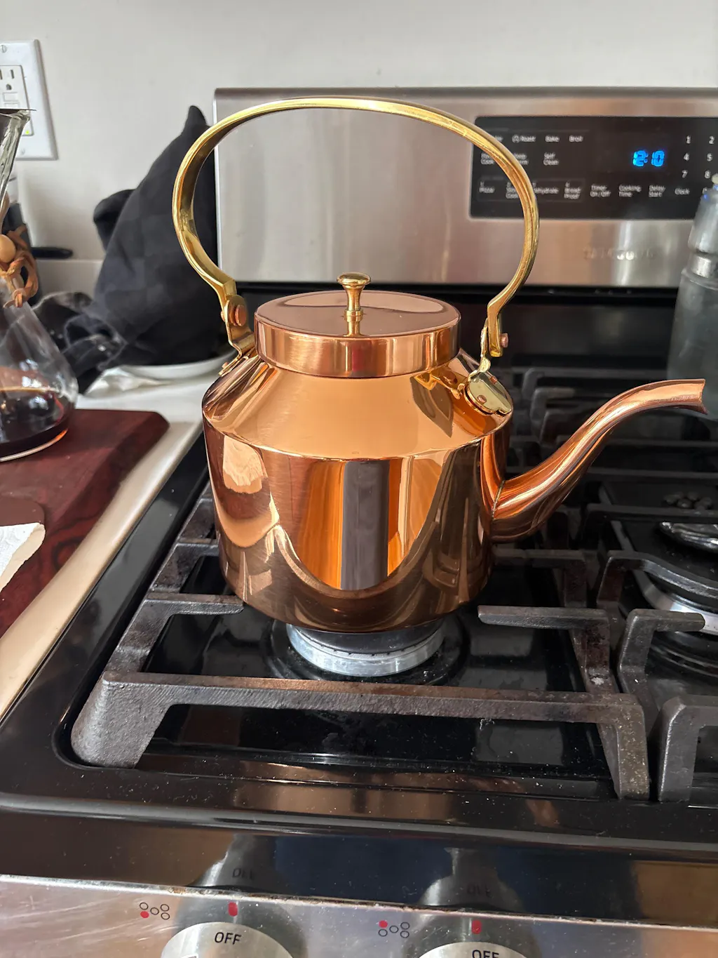 This gorgeous kettle is well-made (without any lead solder!) and a joy to see on the stove. The only small disappointment is that the lid, which fits beautifully, is fitted to the outside of the opening and thus, drops of hot water come down onto the surrounding area when pouring the hot water. This includes the hands and stove. I love it and it’s very accurate for pour-over coffee. Just, WITH a tea-towel.